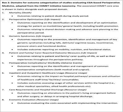 Aim: To systematically identify and categorise outcome measures used in studies assessing the effectiveness of CGA-based perioperative medicine services for older adults undergoing surgery, when compared to routine perioperative care.
