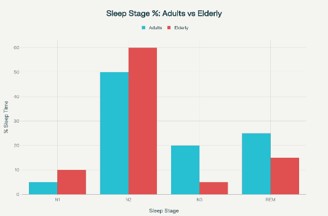 Aging is accompanied by distinct alterations in the quantity and quality of sleep (Figures 1 & 2). One of the most consistent findings is a decline in slow wave sleep, often referred to as deep sleep, with a corresponding increase in lighter sleep stages [3]. Older adults spend less time in stages of restorative slow wave sleep and more time in Stage 1 sleep, which is more easily disrupted by external stimuli. Rapid eye movement sleep also becomes more fragmented, leading to frequent brief arousals that reduce the continuity of the sleep cycle [4].