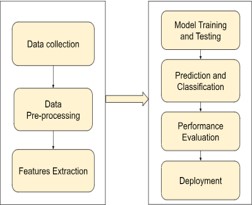 The figure 2 shows the DL workflow which comprises of the data collection followed by the pre-processing techniques and feature extraction. The pre-processed dataset is splitted and the model training is done [10]. The trained model is used for model validation and prediction. DL algorithms like ResNet-169, EfficientNetB2, CNN algorithm is utilized for the model classification and finally for the performance evaluation is done and deployment takes place.