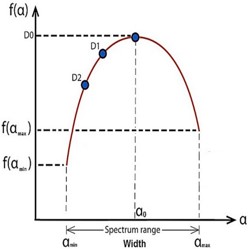 From the figure 7, The dimensions D1 and D2 are information and correlation, respectively [14]. α0 is the the local dimension at the maximal singularity spectral curve, αmin is the local minimum dimension, f(αmin) is the singularity spectrum’s beginning value, αmax the largest local dimension, f(αmax) is the singularity spectrum’s final value, W is the singularity spectrum’s width, The singularity spectrum curve’s symmetric shift, The apparent region of image (A)’s brain segment [10].