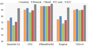 Examining the model’s performance with respect to a certain dataset is a crucial task. This study assessed multiple evaluation metrics which includes recall, accuracy, precision, F1 score and area under the curve [7].