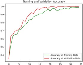 Python code has been used for the training and testing process. The code contains several libraries such as tensorflow, numpy, matplotlib, keras which is a higher-level neural networks API that comes integrated with tensorflow [1]. The loading of the training and test datasets is done using tf.keras.preprocessing.image_dataset_from_directory(). A neural network model with multiple layers is created using keras that contains convolutional, Max-pooling, Dropout and Dense layers. Sparse categorical cross-entropy loss function and Adam optimizer are used to build the model. The training process is run for 35 epochs as shown in figure 8. The loss and accuracy gained is plotted and the visualization of the test images and predictions are made which was displayed in figure9. Finally, the trained model is stored as “ALZ.h5 ‘’ in HDF5 format [12].
