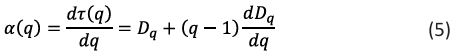 The equation (3) shows the information dimension that describes how quickly information is lost over time or acquired through a series of measurements. From equation (3), n(a) is the total number of fractal copies that are based on the scale a, Pi(a) is the growth probability function of the ith fractal unit and the order of moment is denoted as q.