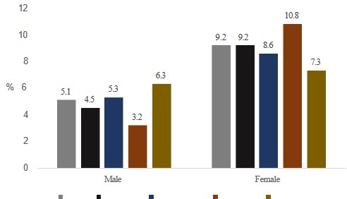 | Male | 411(32.2) | 688(29.8) | 325(29.1) | 427(34.0) | 299(30.3) |