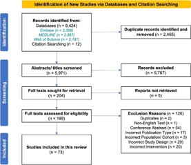 Our systematic search of three online databases, supplemented with citation searching from three previously published systematic reviews evaluating perioperative CGA, identified a total of 8,436 articles. Following de-duplication, the abstracts of 5,971 articles were screened for inclusion. The results of abstract and full-text screening are detailed in the PRISMA (Preferred Reporting Items for Systematic Reviews and MetaAnalyses) diagram in Figure 2, which also shows the reasons for article exclusion. Two-stage screening with independent reviewers resulted in the inclusion of 73 studies in the final analysis, which reported on a total of 65 participant cohorts (eight studies described post-hoc/ follow-up analyses on a previously studied cohort). Table S1 of the Supplementary Material contains a full reference list of included studies.