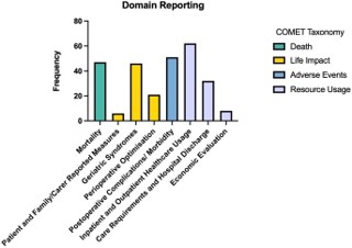 Results: Seventy-three eligible studies were identified: 27 controlled trials (randomised/ pseudo-randomised/ non-randomised) and 46 observational studies. Fortyfive studies (62% of included studies) reported on CGA in patients undergoing emergent orthopaedic/trauma surgery. A median of seven unique outcome measures were identified per study (IQR4-12) with length-of-stay (n=54/73, 74%) and mortality (In-hospital mortality n=31/73, 42%; 1-year mortality n=21/73, 29%; 1-month mortality n=19/73, 26%) reported most commonly. Domain mapping showed frequent reporting of outcomes evaluating healthcare resource utilisation (n=62/73, 85%) and postoperative complications (n=51/73, 70%), with under-representation of patient-reported or quality-of-life metrics (n=6/73, 8%). Additionally, few studies reported on the cost-effectiveness of perioperative CGA (n=8/73, 11%).