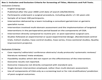 Studies reporting any experimental or quasi-experimental study design with at least 100 participants were eligible for inclusion, including randomised control trials, observational studies (retrospective and prospective) and results published from quality improvement projects. Literature reviews, systematic reviews, meta-analyses, and study protocols were excluded. Additionally, case reports, editorials and conference abstracts were excluded due to difficulties in ensuring fidelity to the principles of CGA. Smaller studies with fewer than 100 participants were also excluded as we sought to capture those outcome metrics which can be measured at a sufficiently large scale within future implementation-effectiveness trials.