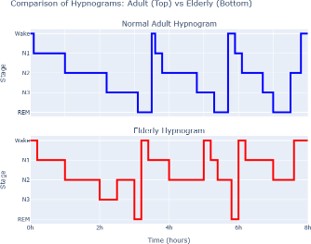 Aging is accompanied by distinct alterations in the quantity and quality of sleep (Figures 1 & 2). One of the most consistent findings is a decline in slow wave sleep, often referred to as deep sleep, with a corresponding increase in lighter sleep stages [3]. Older adults spend less time in stages of restorative slow wave sleep and more time in Stage 1 sleep, which is more easily disrupted by external stimuli. Rapid eye movement sleep also becomes more fragmented, leading to frequent brief arousals that reduce the continuity of the sleep cycle [4].