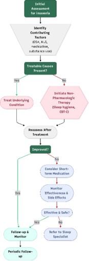 Management of insomnia in elderly patients centers on identifying and addressing underlying medical, psychiatric, or environmental contributors through careful assessment (Figure 3).