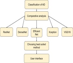 F. Comparative analysis is done for the classification of AD to choose the best suited algorithm for better efficiency and accuracy. EfficinetNetB2 is the best suited method for the classification since it provides peak accuracy about 97.22% and also significantly less loss.