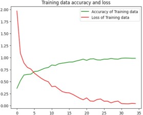 Python code has been used for the training and testing process. The code contains several libraries such as tensorflow, numpy, matplotlib, keras which is a higher-level neural networks API that comes integrated with tensorflow [1]. The loading of the training and test datasets is done using tf.keras.preprocessing.image_dataset_from_directory(). A neural network model with multiple layers is created using keras that contains convolutional, Max-pooling, Dropout and Dense layers. Sparse categorical cross-entropy loss function and Adam optimizer are used to build the model. The training process is run for 35 epochs as shown in figure 8. The loss and accuracy gained is plotted and the visualization of the test images and predictions are made which was displayed in figure9. Finally, the trained model is stored as “ALZ.h5 ‘’ in HDF5 format [12].
