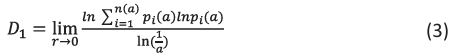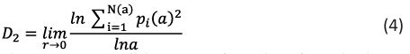 The equation (3) shows the information dimension that describes how quickly information is lost over time or acquired through a series of measurements. From equation (3), n(a) is the total number of fractal copies that are based on the scale a, Pi(a) is the growth probability function of the ith fractal unit and the order of moment is denoted as q.